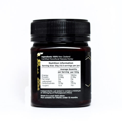 Manuka med sa MGO kodom 250+ je certificiran da sadrži najmanje 250mg metilglioksala (MGO) po kg proizvoda.