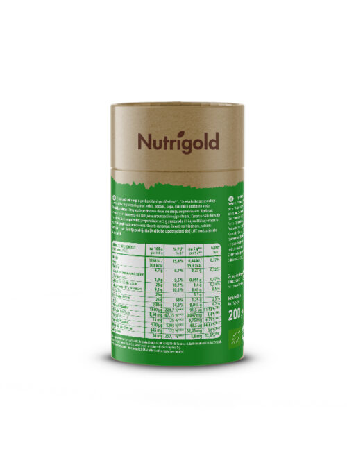 Nutrigold moringa u prahu sadrži 100% sirovu moringu u prahu iz organski certificiranog uzgoja. Dobivena je sušenjem kvalitetnih i pažljivo uzgojenih svježih listova moringe koji zatim prolaze nježan proces mljevenja u fini prah.